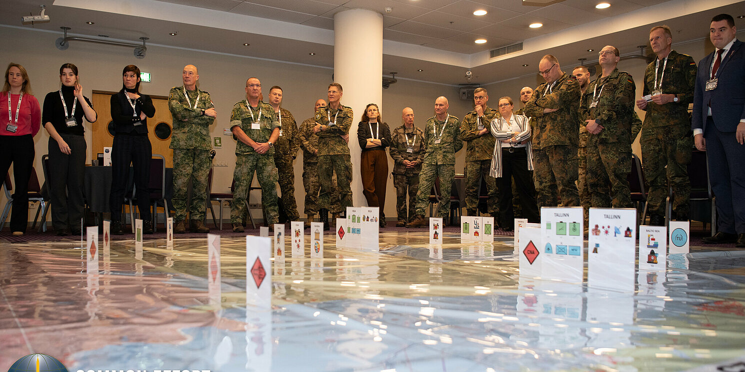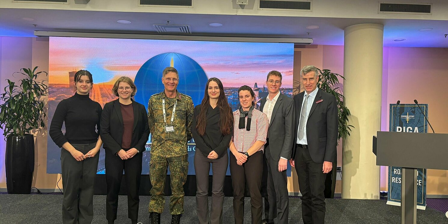 Rund 50 Teilnehmende der Konferenz aus insgesamt 18 Nationen arbeiteten im Rahmen eines szenariobasierten Trainings am ersten Konferenztag gemeinsam an der Bewältigung eines fiktiven Krisenszenarios im Baltikum. Die Studierenden haben die Organisation dieses Formats bereits im Vorhinein unterstützt und hatten während der Durchführung die Aufgabe, die Prozesse und Entwicklungen zu beobachten und insbesondere die Kooperationsdynamiken und identifizierten Herausforderungen zu dokumentieren. Die Ergebnisse wurden anschließend im Plenum präsentiert und fließen nun in die konzeptionelle Weiterentwicklung der zivil-militärischen Zusammenarbeit des 1. deutsch-niederländischen Korps ein. Das hohe Engagement und die außerordentliche Leistung der Studierenden wurde sowohl von Teilnehmenden als auch den Organisatoren ausdrücklich hervorgehoben.